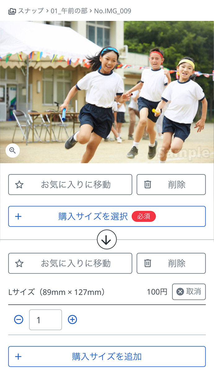 写真の近くにある「購入サイズを追加」ボタンを押し、購入したいサイズを選択して「OK」ボタンで追加してください。